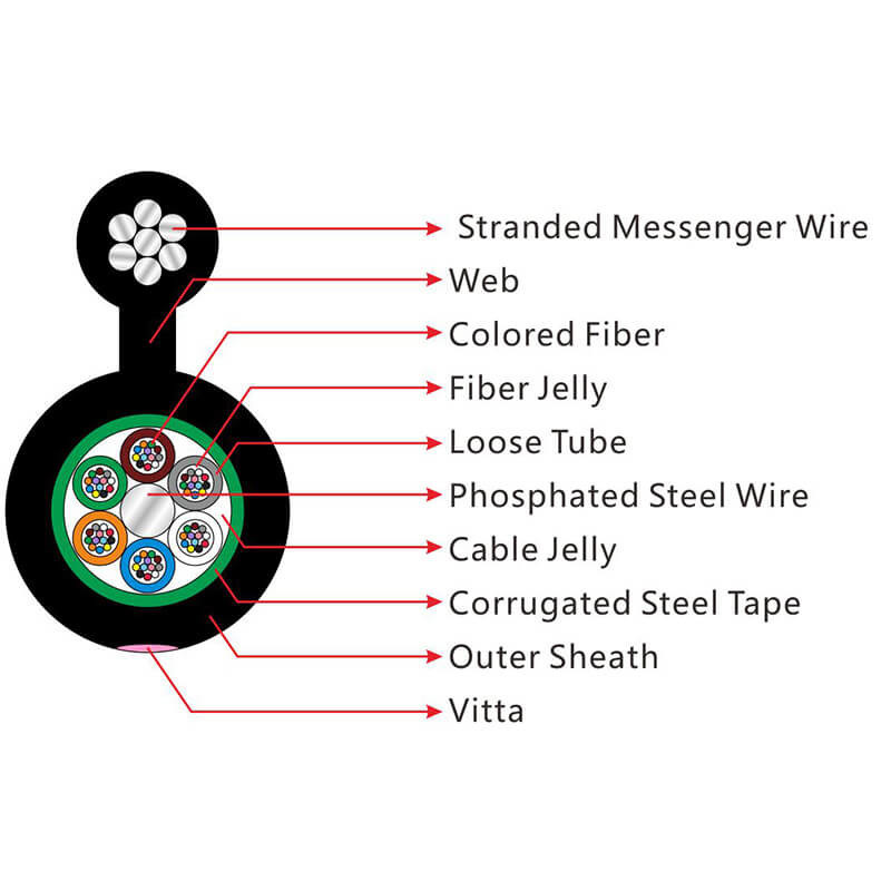 Волокна помещают в простую трубку из высокомодульного пластика, которую заполняют водонепроницаемым заполнителем.Стальная проволока расположена в центре ядра в качестве металлической прочности члена. Трубки (и наполнители) привязаны вокруг прочности в компактное и круглое ядро кабеля. После нанесения PSP вокруг ядра кабеля,эта часть кабеля, сопровождаемая проводами, как поддерживающая часть, завершается полиэтиленовой оболочкой (PE), которая является структурой фиг. 8Этот вид кабеля специально применяется для самоподдерживающейся воздушной установки.